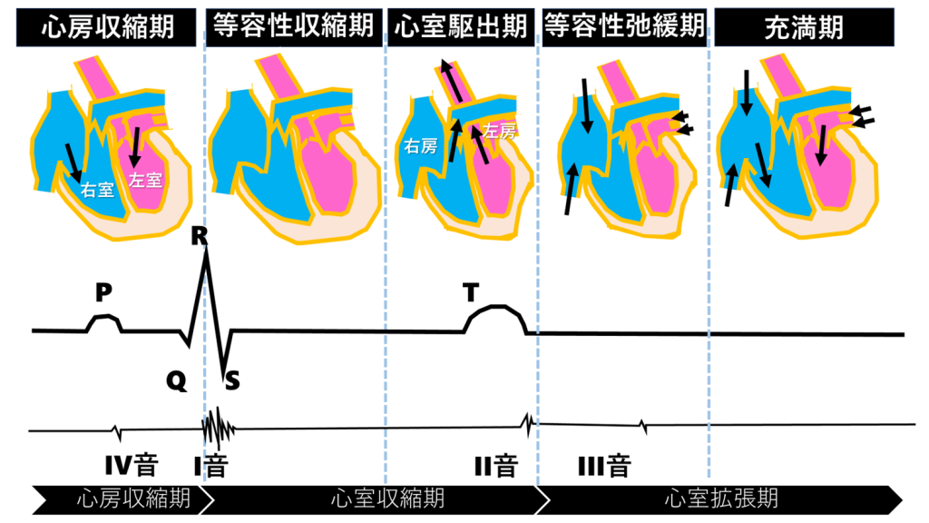 心臓は次のように収縮と拡張を行い、それに伴ってP波QRS波T波という電気的な興奮が引き起こされます。心音は「ドッ」というI音や、「クン」というII音が聞き取れます。